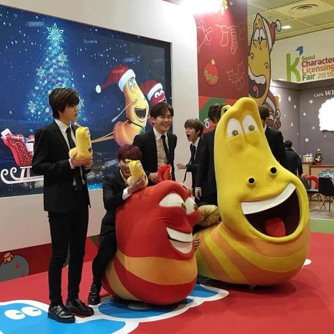 (Infinite was invited to a character fair and they bursted out laughing when they saw dolls that were as big as theirselves and compeletely forgot they were there for a photo-time)