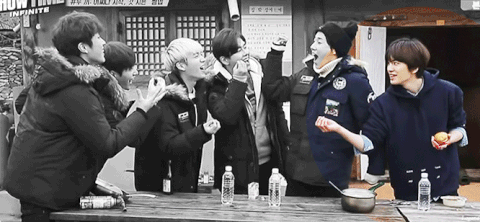 The Hyungs: Impersonating the maknae, making fun of the maknae by revealing that he doesn't have abs.
