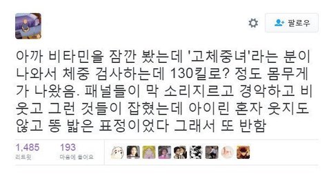I saw Vitamin today and there was a guest who got a check up, her weight was revealed and it was around 130kg..? The audience were screaming, and some were laughing, making fun of the guest .. But Irene was the only one who didn't, she looked as if she just stepped on a poop (The OP saying that Irene was the only one who's not making fun of the guest, she didn't find it funny).. I fell for her charms again today..